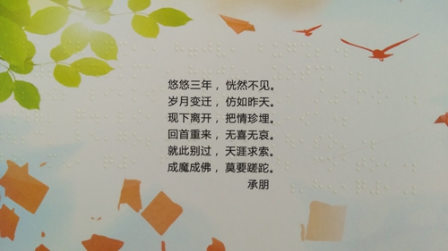 感謝所有為“盲文畢業(yè)紀(jì)念冊”做出奉獻(xiàn)的人,因?yàn)槟銈?,世界更美麗。掃描封面二維碼,聆聽2018屆貳家畢業(yè)班同學(xué)的校園故事,不知不覺,熱淚盈眶,感動之余,我明白了“讓印刷走進(jìn)千家萬戶,為幸福生活添色加彩”的真實(shí)含義。