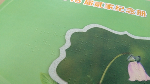 一個架子上,放著一疊厚實(shí)的精裝冊子,封面寫著“2018屆貳家紀(jì)念冊”。翻開冊子,與以往見到的一樣,紙面印著一張張燦爛而純真的笑臉和一些文字,不一樣的是,紙面上還多了一些微微凸起圓點(diǎn),大約厚度1mm左右,按一種特有的規(guī)律排列,看起來晶瑩剔透,用手撫摸一下,顆粒感很真實(shí),這就是“盲文畢業(yè)紀(jì)念冊”。