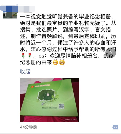感謝所有為“盲文畢業(yè)紀(jì)念冊”做出奉獻(xiàn)的人,因?yàn)槟銈?,世界更美麗。掃描封面二維碼,聆聽2018屆貳家畢業(yè)班同學(xué)的校園故事,不知不覺,熱淚盈眶,感動之余,我明白了“讓印刷走進(jìn)千家萬戶,為幸福生活添色加彩”的真實(shí)含義。